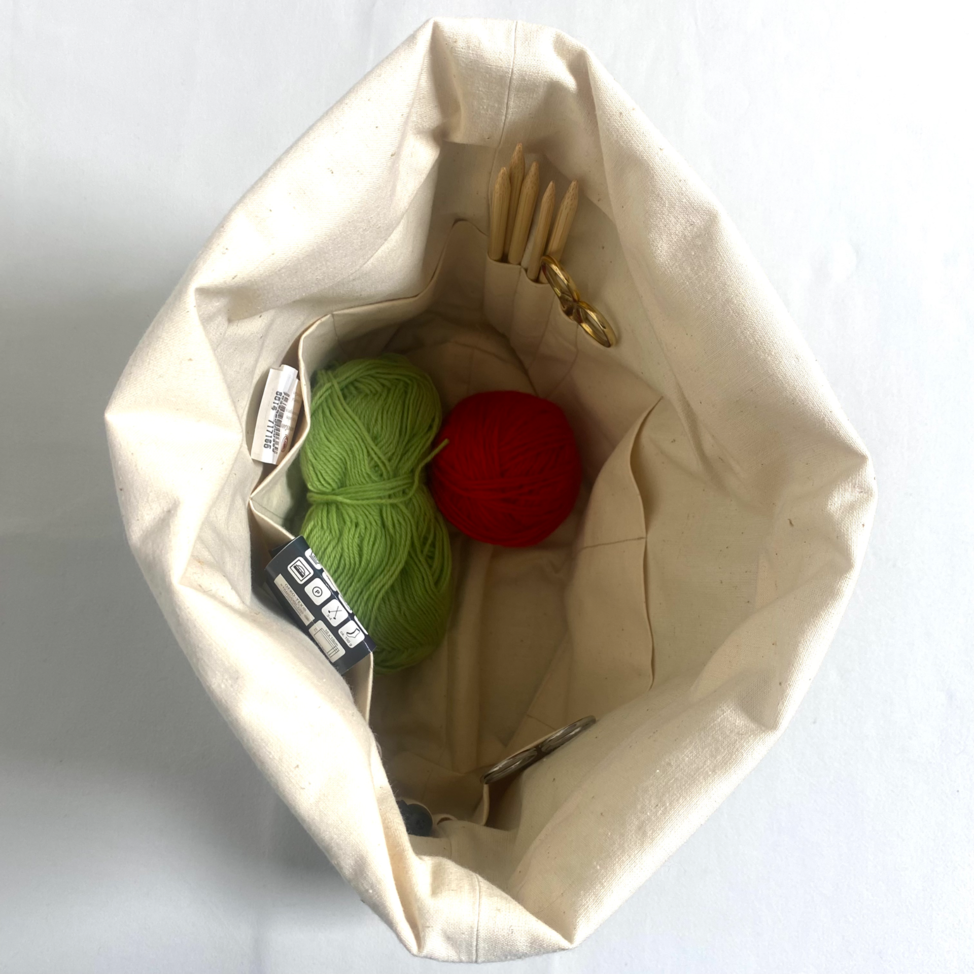 Hilma projektikassissa voit säilyttää keskeneräisiä neuleita tai muita käsitöitä. Kassi on 100% pellavaa ja vuori valkaisematonta raakapuuvillaa. Kassi on tuettu ja säilyttää hyvin muotonsa. Hilma asettuu kauniisti käsivarrelle ja voit neuloa jopa seisten. Kassin sisäosaa kiertää tarvikkeille tarkoitettu taskuosio, johon voit laittaa erilaisia tarvikkeita puikoista saksiin ja vyötteistä neuleohjeisiin. Kassin vuorin yläreuna kiristyy pellavanauhan avulla ja reunan saa myös käännettyä kassin reunan yli. Kassiin mahtuu muutama lankakerä, pieni tai keskikokoinen neule, kuten sukat tai huivi tarvikkeineen.