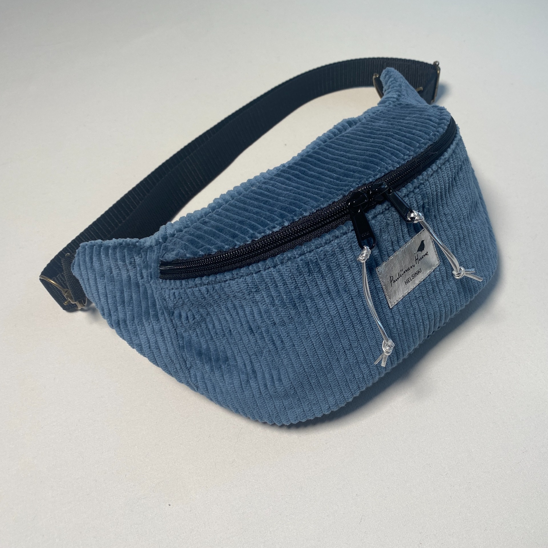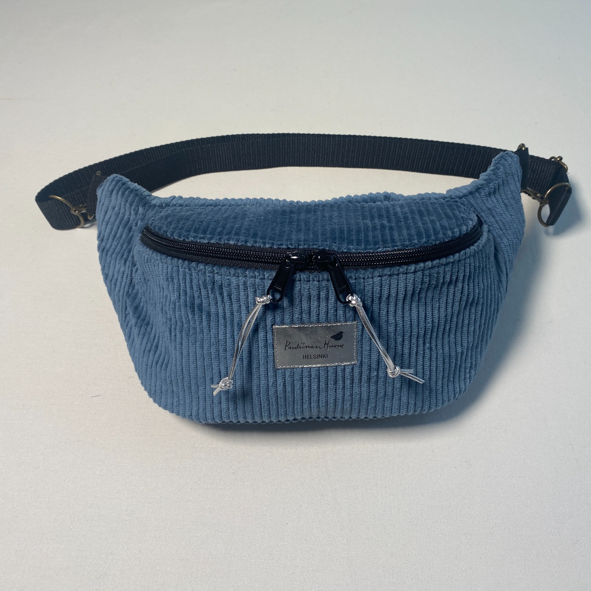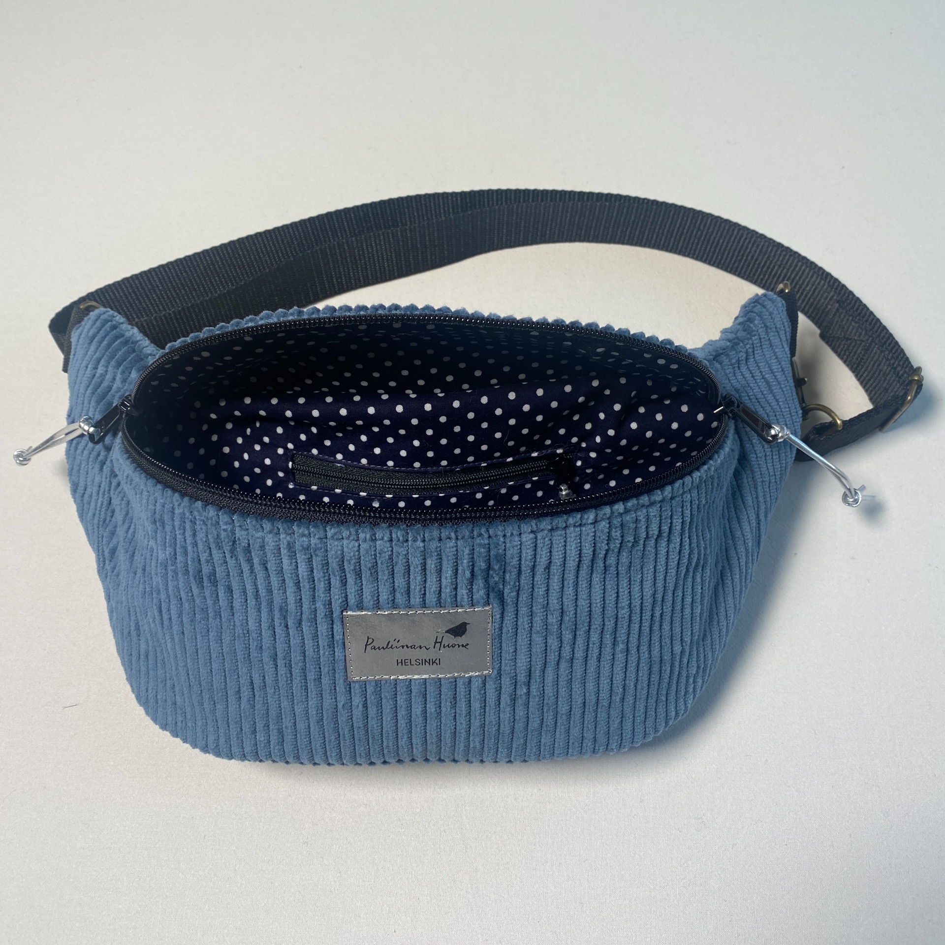 Palko crossbody -laukku on valmistettu siniharmaasta, leveäraitaisesta vakosametista ja se on vaatetuskangasta. Laukku on kauttaaltaan tuettu ja säilyttää siksi hyvin herneenpalkoa muistuttavan muotonsa. Vetoketjussa on kaksi vedintä, jolloin ei ole väliä kummalla puolella laukkua kannat. Sisällä vuori, jossa mustalla pohjalla valkoisia pilkkuja ja vetoketjullinen sisätasku. Vetoketjujen vetimissä on hopeanväriset tekonahkaiset nauhat. Hihna on tukevaa polyesteriä, 3cm leveä ja pisimmillään 94cm, lyhimmillään 53cm. Metalliosat ovat antiikkimessinkiä, hihnassa on papukaijakiinnitys ja sen voi kokonaan irrottaa. Laukkua voi halutessaan kantaa myös vyötäröllä. Laukku on monikäyttöinen ja tyylikäs asuste arkeen ja juhlaan, myös erityisen kätevä pyöräillessä. Laukku on valmistettu käsityönä Helsingin Vallilassa. Laukun pituus sivupaneelista sivupaneeliin 33cm, korkeus 12cm, syvyys 8cm.